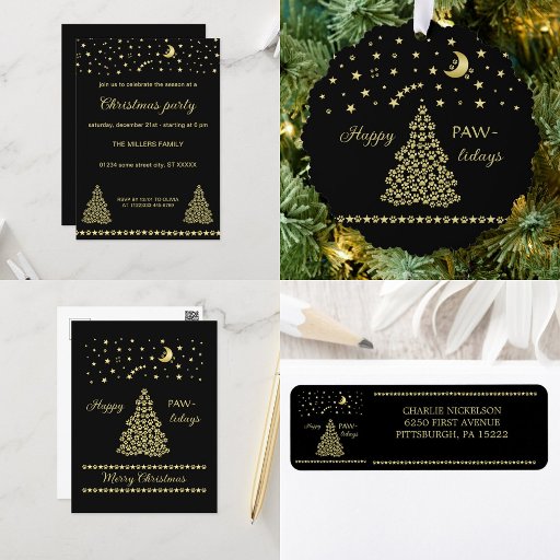 Erstellt Weihnachtsbaum aus goldenen Hundpfoten, darüber ist ein Sternenhimmel mit dem Mond, und unten ist ein schönes Ornament aus kleinen Pfoten und Sternen. Treten Sie ein in die Welt der festlichen Freude mit unserer Happy Pawlidays Kollektion! Feiern Sie die Saison mit Freude, Liebe und dem unverwechselbaren Charme der Zornfreunde. Unsere Kollektion Pawlidays erweckt den Zauber des Urlaubs zum Leben, indem sie den Geist des Zusammenlebens und die Freude, die Haustiere in unser Herz bringen, umarmt. Happy Pawlidays - wo jeder Augenblick in die Wärme der Freundschaft und den Schimmer goldener Pfoten eingebettet ist. Du musst wissen, dass du ein Foto bekommst!