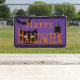 Zeigen Sie diese glückliche Halloween-Fahne in Ihrem Yard, im Geschäftssitz oder in der Nachbarschaft an. Wünschen Sie jeder ein glückliches Halloween mit einer schwarzen Katze, einem fliegenden schwarzen Schläger und einer sitzenden schwarzen Eule. Stilvolle lila und schwarze Streifengrenzen.