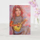 aus einem Aquarellbild, das ein Mädchen mit roten Haaren zeigt, das Ukulele spielt, auch mit dem Slogan "Happy ukulele days"