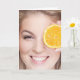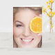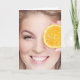 Eine lächelnde Frau hält ein orangefarbenes Stück über einem Auge. Für jene Zeiten, in denen verspätete Geburtstagskarten besser geeignet sind.