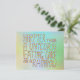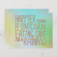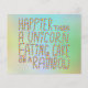 Ein Slogan in bunten Schriften auf einem Hintergrund verschiedener Farben, sagt der Slogan: Happier als ein Einhorn Eating Cake On A Rainbow.