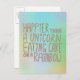 Ein Slogan in farbenfroher Schrift auf einem Hintergrund verschiedener Farben, sagt der Slogan: Glücklicher als ein Einhorn, der auf einem Regenbogen Kuchen isst.