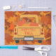 Spaßherbst-Ausrüstungsbeschreibungen ein blasser orange Lieferwagen-LKW, der mit drei Kürbisen gegen eine Mischung des Herbstes gefüllt wird, verlässt Hintergrund. Heckklappe liest glücklichen Fall Yall.