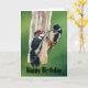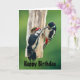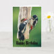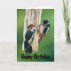 Glückliche Geburtstagskarte mit einem männlichen Great Gepunktet Woodpecker, der einen Jungtier auf einem Holzvogelleger füttre. Große gepunktete Spechte leben das ganze Jahr über in Europa. Die Innenseite der Karte ist leer für Ihre eigene Nachricht.