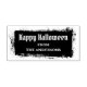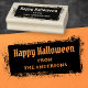 Gummi Briefmarke mit dem Text "Happy Halloween" in einem gotischen Schriftart mit Ihrem Namen unten. Negativer Text auf einem gritty Grunge Rechteck Hintergrund.