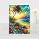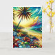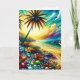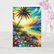 Hübsche Jubiläumskarte. Farbenfrohe abstrakte Aussicht auf das Meer, Palmen, Steine am Strand bei Sonnenuntergang.