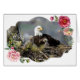 Ein süßes Bild einer salzigen Adlermutter mit ihren Nestlings. Set an einem blühenden Rand.