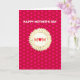 Glückliche Muttertagskarte mit einer wunderschönen Sonnenblume und das Wort MAMA in der Mitte auf einem roten Hintergrund mit Magenta-Herzmuster.