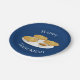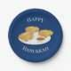 Glücklicher ChanukkapapierTeller mit drei lächelnden Latkes auf einer weißen Platte mit Apfelsauce und saurer Creme. Die Wörter "glückliches Chanukka" sind im Weiß und der Pappteller hat einen blauen Hintergrund.