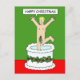 Ein Cartoon, der nur einen Haufen Misteloe trägt und aus einem Riesenkuchen-Sprichwort "Happy Christmas" springt.