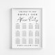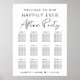 Modernes Hochzeitsstempelposter zum Download für bis zu 12 Tische mit "Welcome To Our Happily Ever After Party" in einer Mischung aus stilvollem Drehbuch und einfacher Typografie, Ihren Namen und Ihrem Hochzeitsdatum, verbunden durch ein Herz.