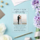 Elegante Einführung oder kleine Hochzeitsankündigung und Hochzeitsempfang klare Acryleinladung mit Ihrem Hochzeitstag Foto, "Happily Ever After Party" in einer Mischung aus einfachen Typografie und schicker Schrift, Ihren Empfang Details und Ihren Namen in einem signaturähnlichen Skript.
