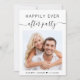 Chic elopement oder private Hochzeitsankündigung und Empfang-Einladung mit Ihrem Foto, "Happily Ever After Party" in einer Mischung aus einfachen Buchstaben und einem stilvollen Swash-Skript und Ihren Vornamen und Hochzeit-oder Empfang-Datum verbunden durch ein Herz. Auf der Rückseite, personalisieren Sie Ihre Heiratsankündigung und Empfang Details und fügen Sie Ihre Namen in einem signaturähnlichen Skript.