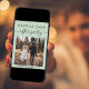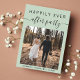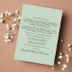 Modernes schlaues grünes Elopement oder kleinere Hochzeitsankündigung und Einladung zum Empfang, um Familie und Freunden zu informieren, dass Sie an einer kleinen Hochzeitsfeier verheiratet waren, und sie jetzt zu einem Hochzeitsempfang einzuladen. Die Vorderseite zeigt Ihr Hochzeitstag Foto und "Happily Ever After Party" in einer Mischung aus einfachen Typografie und trendigen Drehbüchern mit Swashes. Fügen Sie unter Ihrem Foto Ihre Vornamen und Ihr Hochzeitstermin hinzu. Auf der Rückseite personalisieren Sie Ihre Nachricht detaillierter und fügen Sie Party- oder Empfang-Einladungsdetails und Ihre Namen in ein signaturähnliches Skript ein.
