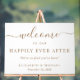Chic weißes Acryl Begrüßungszeichen für Ihre Hochzeit mit "Welcome To Our Happily Ever After" in einer Mischung aus einfacher moderner Typografie und einem eleganten Drehbuch mit Swashes, "We are so frohe you are here," und Ihren Namen und Ihren Hochzeitstag.