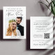 Elegante Ankündigung Datum freihalten für Ihr Post-Etage oder kleine Hochzeitsempfang oder Feier Party. Die Vorderseite zeigt Ihr Hochzeitsfest Foto und "Save the Date für unser glückliches Ever After Party" in einer Mischung aus einfacher Typografie und einem schicken, modernen Drehbuch. Fügen Sie unter Ihrem Foto Ihre Vornamen und Ihr Hochzeitstermin hinzu. Auf der anderen Seite, personalisieren Sie Ihre Save the Date Nachricht detaillierter, erstellen Sie einen QR-Code, der mit Ihrer Hochzeitswebsite verknüpft ist, damit Ihre Gäste nach weiteren Informationen suchen und Ihre Namen in einem signaturähnlichen Skript hinzufügen können.