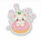 Kawaii-Katze sitzt in einem rosa glasierten Donut mit einem kleinen Blatt, lächelt mit rosigen Wangen, umgeben von Sternen und Herzen.
