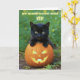 Für ein wunderbares Kind dieses Halloween! Stellen Sie sich ein spielerisches schwarzes Kätzchen neben einem glühenden, geschnitzten Kürbis vor.