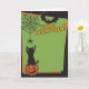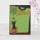 Kundengerechte Halloween-Karte einer Katze, die auf einem Kürbis sitzt und mit mit einer Spinne spielt.
