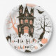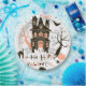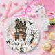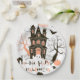 Vervollkommnen Sie für Halloween! Dieses niedliche Ausrüstungsbeschreibungen ein orange und schwarzes Motiv mit einer Spuk Hausfront und -mitte, mit zwei bloßen Bäumen auf beiden Seiten. Ein Vollmond aboce, mit einem Geist-Sprichwort BOO, ein Schläger, ein Jack, der auf dem Rasen o'lantern sind und eine schwarze Katze alle fügen dem Halloween-Ambiente hinzu.
