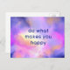 Eine Postkarte mit einem inspirierenden Zitat, in dem steht: "Tun Sie, was Sie glücklich macht". Der Hintergrund ist ein leuchtendes Raumbild mit ätherischen Wolkenformen und leuchtenden Sternen.