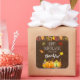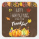 Ein Aufkleber, auf dem steht: Glücklicherweise zum Erntedanken eine Zeit, um dankbar zu sein. Eine Aquarellbild von Kürbissen, Eicheln, Pilzen und saisonalen Herbstblättern. Ein Rand oben, der aus Herbstlauben, Beeren, Eicheln und anderem Blattwerk besteht. Eiche, Ahorn und Elm Blätter fallen um den Buchstaben herab. Dunkelbrauner Hintergrund.
