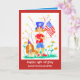 Eine süße patriotische Grußkarte vom 4. Juli mit einem jungen Mädchen in festlich rot, weiß und blau, das die amerikanische Flagge mit ihrem Hundehund an ihrer Seite stehend hat, und Feuerwerk am Himmel. Sie können den Text an Ihre Bedürfnisse anpassen!