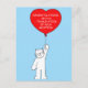 Eine große, weiße, flauschige Katze, die einen großen roten Ballon mit den Worten "Glückwunsch zur Fertigstellung Ihrer Adoption" hält.