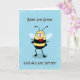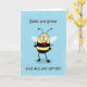 Niedliche Glückwünsche auf einer großen Berichtskarten-Grußkarte kennzeichnet eine Cartoonillustration einer Hummelbiene, Hände auf Hüften auf einem blauen Spritzenhintergrund.