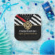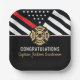 Dieses Design ist mit einer Feuerwehrflagge mit schwarz-weißen Streifen und einem dünnen roten Streifen versehen. "Glückwunsch" und das Abzeichen eines Feuerwehrmanns sitzen über dem Namen des schließend oder pensionierten Feuerwehrmanns, Leutnants oder Chefs. Feiern Sie stilvoll!