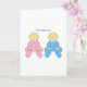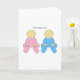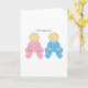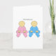 Two twin cartoon babies, one in pink and one in blue, with the word 'Gratulation'.