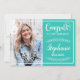 Stilvolle und moderne Abschluss-Ankündigungskarte mit einem großen, anpassbaren Foto auf der verlassen Seite mit weißem Überlagstext mit dem Klassenjahr und einem eleganten türkisfarbenen Hintergrund mit weißem Text, der auf der rechten Seite "Glückwunsch zu unserem Absolventen" lautet. Einfach anpassbar, indem Sie den benutzerdefinierten Text mit dem Namen Ihres Grades, und Abschluss Jahr.
