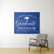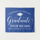 Elegante Abschlussfeier Hintergrund-Zeichen gratuliert und feiert Ihren Absolvent im Stil! Das Design umfasst eine Graduiertenkappe, einen "Graduate" in der Schrift und einen modernen, individuellen Text, der mit dem Namen und der Schule des Absolventen personalisiert werden kann. Die Farben Blau und Weiß können individuell angepasst werden.