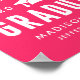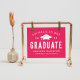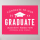 Modernes Abschluss Poster mit fett weißer Schrift mit einem heißen rosa Hintergrund. Das Design zeichnet sich durch eine weiße Graduationskappe mit dem Satz "Glückwunsch zu unserem Graduate" aus. Personalisieren Sie das Schild mit dem heißen rosa Abschluss, indem Sie den Namen, den Namen der Schule und das Jahr des Abschlusses des Absolventen hinzufügen. Für ein individuelleres Aussehen, ändern Sie den Hintergrund in Ihre Schulfarben. Das Abschluss Poster ist ideal für Ihr High School oder Uni-Abschluss Party!