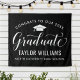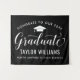 Elegante Abschlussfeier Hintergrund-Zeichen gratuliert und feiert Ihren Absolvent im Stil! Das Design umfasst eine Graduiertenkappe, einen "Graduate" in der Schrift und einen modernen, individuellen Text, der mit dem Namen und der Schule des Absolventen personalisiert werden kann. Die Farben Schwarz und Weiß können individuell angepasst werden.