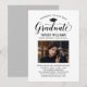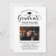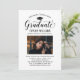 Elegante Abschluss-Ankündigung Karte und Abschlussfeier Einladung gratuliert und kündigt Ihren Absolvent in der Art! Die schwarze Graduiertenkappe, "Graduate" in der Schrift und der moderne, benutzerdefinierte Text, der mit dem Namen, der Schule und dem Party des Absolventen personalisiert werden kann. Fügen Sie ein beliebtes Foto des Abschlusses hinzu. Beachten Sie, dass die neutrale Farbe des grauen Akzents auf der Kartenrückseite in Weiß oder eine andere Farbe geändert werden kann, die mit den Farben Foto oder Party koordiniert wird.