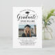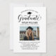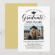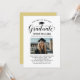 Elegante Abschluss-Ankündigung Karte und Abschlussfeier Einladung gratuliert und kündigt Ihren Absolvent in der Art! Die schwarze Graduiertenkappe, "Graduate" in der Schrift und der moderne, benutzerdefinierte Text, der mit dem Namen, der Schule und dem Party des Absolventen personalisiert werden kann. Fügen Sie ein beliebtes Foto des Abschlusses hinzu. Beachten Sie, dass die Farbe des Champagner-goldenen Akzents auf der Kartenrückseite in Weiß oder eine andere Farbe geändert werden kann, die mit den Farben Foto oder Party koordiniert wird.