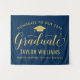 Elegante Abschlussfeier Hintergrund-Zeichen gratuliert und feiert Ihren Absolvent im Stil! Das Design umfasst eine Graduiertenkappe, einen "Graduate" in der Schrift und einen modernen, individuellen Text, der mit dem Namen und der Schule des Absolventen personalisiert werden kann. Navy Blau- und Goldfarben können individuell angepasst werden.