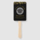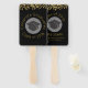Ein Handventilator für den Abschluss. Auf der Vorderseite steht Glückwunsch Absolventen, Klasse von 20xx und auf der Rückseite der Absolvent der Name und Schule und Klasse von 20xx, in einer goldenen Farbe geschrieben. Entwickelt mit einem schwarzen Graduierdeckel, umgeben von einem halbtransparenten weißen Kreis. Imitate goldener Konfetti-Glitzer sprang über die Spitze. Nur ein digitales Bild von Konfetti nicht real. Schwarzer Hintergrund mit goldener Schrift ist einfach, aber stilvoll.