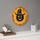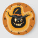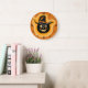 Große Rundwand Art Clock und Zuhause Einrichtung Accessoire mit Gwer Pumpkin Witch On Orange Hintergrund Kunstwerk Design-Bild von TheFabricSeal at Zazzle mit einer schwarzen Silhouette von einem gruseligen Hexenkürbis mit einem spitzen konischen Kronhut und Schnallen-Gurt mit einem flammenden feurigen weißen goldfarbenen Kürbis hinten in den Orange-Kamin im Hintergrund und durch den Kürbisaugen, Nase und Mund ausgeschnitten.