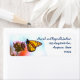 Ein wunderschöner Orangen- und Schwarzklatschmetterling, der durch die helle Sommersonne seine lichtdurchlässigen Flügel erhellt, die sich auf einer lila Schmetterlingssonne-Pflanze-Blume in einem Garten befinden. Passen Sie den blauen Text Ihrem eigenen Namen und Ihrer eigenen Adresse an, die hauptsächlich im weißen Bereich mit einem gezackten asymmetrischen Randrand liegt.