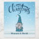 Niedliches Gnomen in blauem Anzug auf blauem und weißem Hintergrund mit Schnee