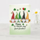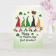 Diese Karte zeigt fünf St. Patrick’s Day-Gnome, die Schulter an Schulter in der Mitte aufgereiht sind, ihre runden Körper und langen weißen Bärte geben ihnen ein gemütliches, kameradschaftliches Aussehen 💚. Links hebt ein Gnom in einer roten Punkte-Mütze einen goldenen Becher, als ob er mit den anderen anstoßen würde, während zwei grünmützige Gnome neben ihm wirbelnde Muster tragen, die die Kleeblätter um sie herum widerspiegeln ☘️. Nahe der rechten Seite hält ein Gnom in einer schwarzen Mütze rote und grüne Luftballons, die wie eine kleine Parade nach oben schweben, und der letzte Gnom trägt eine orange gestreifte Mütze, während er einen glänzenden Topf Gold präsentiert. Ihre Hüte und Requisiten stechen vor einem hellgrünen Farbverlaufshintergrund hervor, mit weicher Schattierung, die die Figuren sanft gerundet und nah beieinander erscheinen lässt, wie Freunde, die sich für ein Foto zusammenlehnen. Kleine Kleeblätter in verschiedenen Grüntönen sind um die Reihe verstreut und füllen den Raum, ohne die Charaktere zu überfüllen. Die Nachricht „Happy St. Patrick’s Day! Great Grandma!“ sitzt in dunkelgrüner Schrift, oberhalb und leicht über der Gruppe platziert, damit sie auf einen Blick