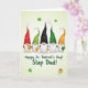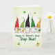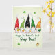 This card shows five gnomes lined up across the lower half of a pale green background, their long white beards brushing together as if they’re standing close for a friendly group photo 💚. Each has a small peach-colored nose and a tall cone hat with white polka dots, colored red, two shades of green, black, and orange, with tassels that curl upward. Small shamrocks drift around them, adding a light St. Patrick’s Day touch without crowding the scene ☘️. One gnome raises a golden tankard, another holds an orange balloon, and a third grips a green shamrock, creating little moments that feel shared and affectionate. Centered above the gnomes, the text reads “Happy St. Patrick’s Day! Step Dad!” in emerald green lettering that stands out clearly against the soft background. The words sit in the middle of the design, leaving open space around them so the characters and icons stay easy to see. In the bottom right corner, a tiny pot of gold gleams beside a few floating shamrock shapes.