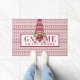 Erleben Sie den Urlaubssgeist mit diesem niedlichen Aquarellbrunnen Doormat mit einem Gnome, der eine rot-weiße Messe-Insel trägt, mitten in der Phrase "gnome sweet gnome". Der Hintergrund ist ein rot-weißes, feines, iselgestreiftes Muster.