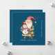 Eine rot gekleidete Gnome steht neben einem Schneemann in einem grünen Strumpf mit Hut und rotem Schal. Sie sind umgeben von einem weißen Schneeabbau, der auf dem dunkelblauen Hintergrund Pop. Die minimalistische Ästhetik entsteht mit einem einfachen Frohen Weihnachten unten und der Firmenname läuft senkrecht auf dem rechten Rand. Eine bearbeitbare Weihnachtsbotschaft ist auf der Rückseite und ein Ort für Ihr Geschäft. Legen Sie einfach Ihr Firmenlogo unten. Ein kleiner Weihnachtsbaum schmückt das Oberteil.