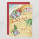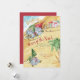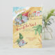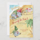 Spaß Strand Thema Weihnachtskarte, mit dem Buchstaben "Dashing Through the Sand zu wünschen Ihnen ein sehr frohes Weihnachten". Das Design umfasst einen goldenen Sandstrand, tropische Palmen und blauen Ozean mit fröhlichen Gnomen auf einem Schlitten, der mit Weihnachtsbeleuchtung geschmückt ist und eine Schlitte voller Weihnachtsgeschenke zieht. Es gibt noch ein Gnome, das mit einem Weihnachtsbaum vorbeiläuft. Farbenfrohe niedliche Gestaltung in Rot, Gold und Grün.