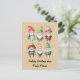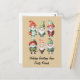 Wintergekleidete Zwerge nissern mit Hüten und Schals. Feierliche Grüße von frostigen Freunden. Text kann geändert werden. Keine zusätzlichen Kosten.