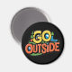 Eine lebendige und spielerische Illustration, die die Erkundung im Freien fördert. Die Wörter "GO OUTSIDE" werden mit einem Hintergrund hervorgehoben, der sanfte Hügel, Pinienbäume, einen Wanderstiefel und einen Blick auf einen bunten Ball zeigt, der Aktivitäten wie Wandern und Spielen in der Natur nahe legt.