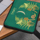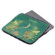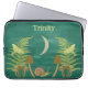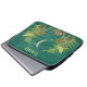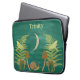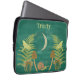 Meine Illustrationen zeigen eine natürliche Welt mit dunklen Untertönen. Ein Halbmond hängt am Himmel über einer Szene aus grünen Farnen, gelben Motten, braunen Pilzen und einer grünen und braunen Schnecke, die das ganze Set vor einem aquamarinen, bemalten Hintergrund bildet. Dieser Laptop-Ärmel ist bereit, mit einem Namen oder einem anderen Text in gelber Schrift personalisiert zu werden.